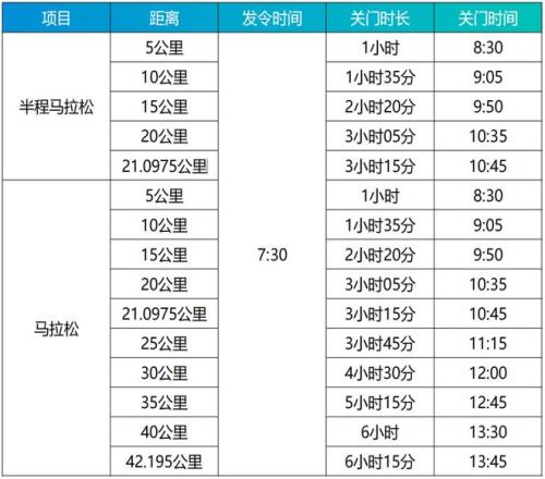2.比赛当天起点存衣服务将于7:15截止,请选手做好时间安排。半程马拉松选手在比赛当日11:30前,马拉松选手在14:30前到指定存衣处领取个人存放物品。