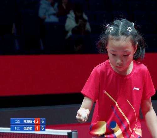 陈思杨又一次夺冠了。这位来自江西的小姑娘训练非常刻苦,手上练出了血泡还会继续练,她不怕苦不怕累。陈思杨被誉为小魔王、小邓亚萍。从身高来看,陈思杨是进入决赛的小队员当中个子最小的一位。她目前比吴扆依矮小,力量不如对方,但是她的挥臂速度非常快,脚下移动也很快。期待又萌又能打的陈思杨继续蜕变。