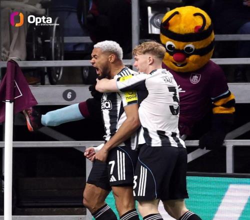 此役客场对阵伯恩利,纽卡斯尔联中场乔林顿在开场第2分钟破门,为喜鹊军团取得1-0领先。